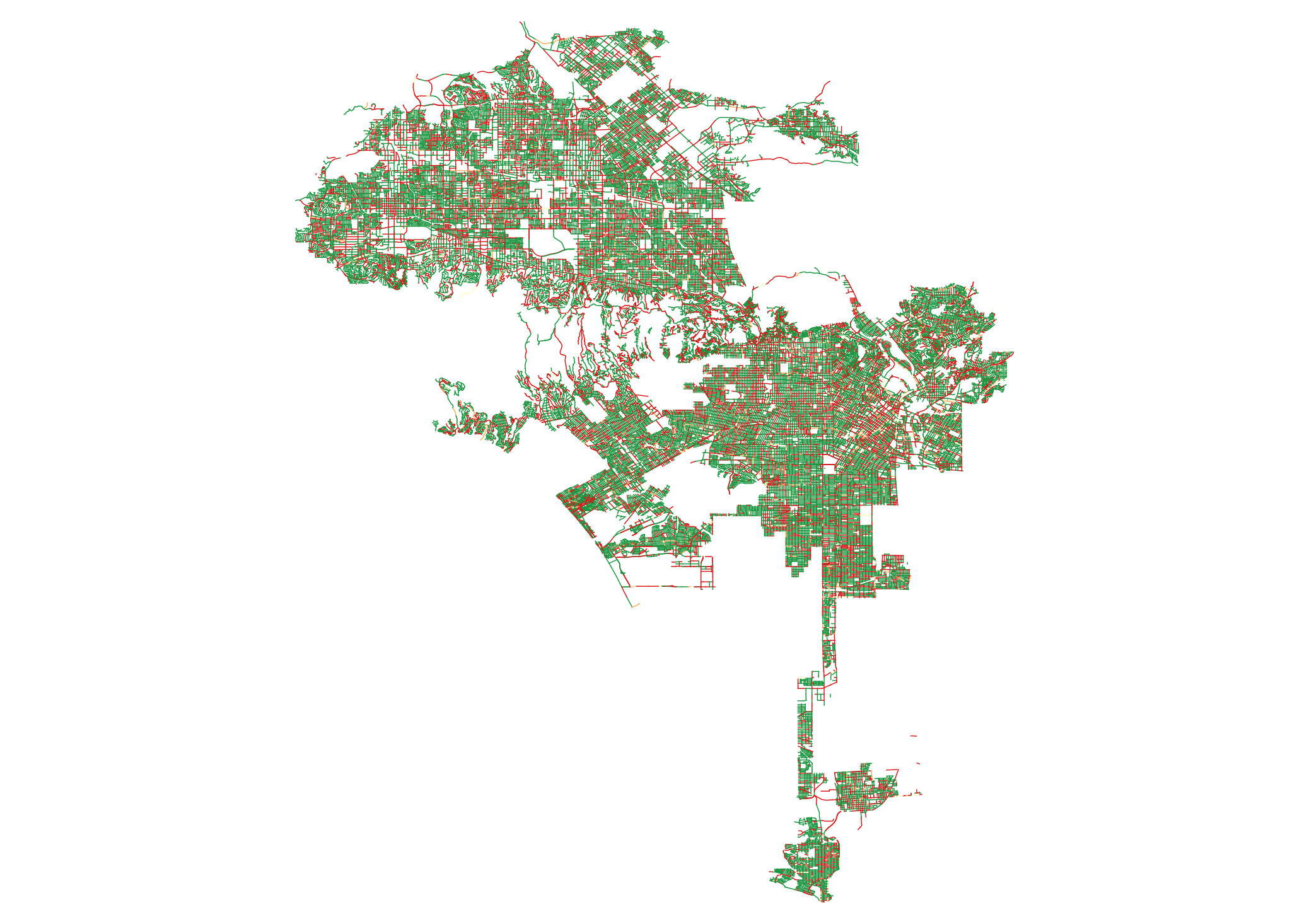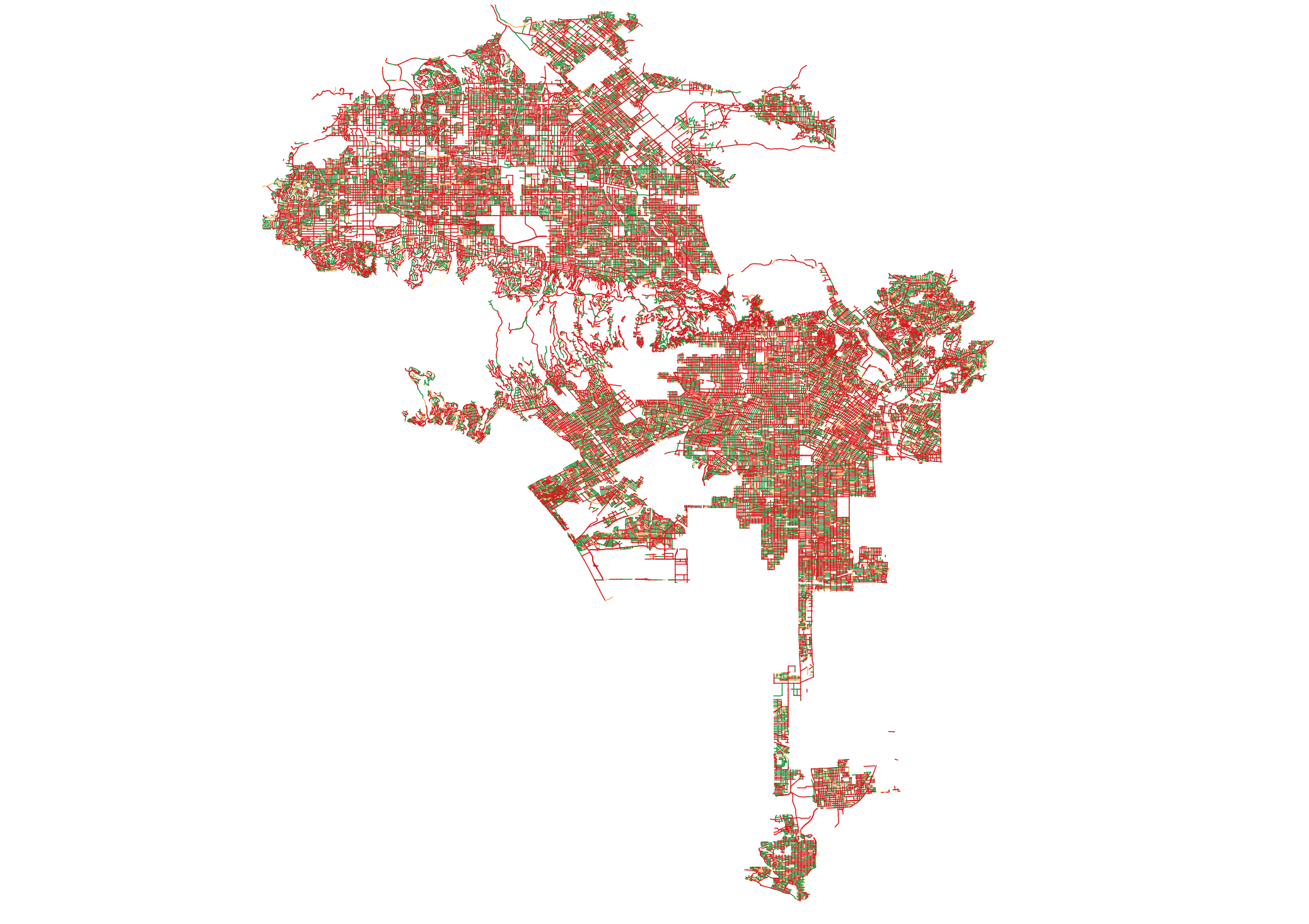 Meanwhile we simulated the aging of all untreated streets following the curves shown above in this report. Unfortunately the actual data do not remotely reflect the tidiness of that curve. The real age-to-PCI data is scattered and as bumpy as an unmaintained LA alley. We assume this is because while the age is a simple calculation of the last time a road was repaved, the City regularly goes back and patches potholes and cracks. This may improve PCI, and fracture the neat pattern relationship we would expect to see between age and condition. However the first six years after a road is repaved its PCI does seem to follow a curve. We surmise that this is because the city doesn’t actually measure the PCI of recently repaved roads but instead estimates it using the given curve (or something similar). After that all real correlation between age and PCI is lost. We have survivor effects (for example, concrete roads more than 40 years old often have a PCI higher than their younger siblings), outliers (roads that are only 12 years old with a PCI of a road three times older) and generally all manner of noise in the data. We don’t know how much of this is bad data, sporadic measurements (our Freedom Of Information Act request for historical PCI data was denied, so we were unable to compare changes for specific segments over time), or just a truly weak correlation between age and PCI.