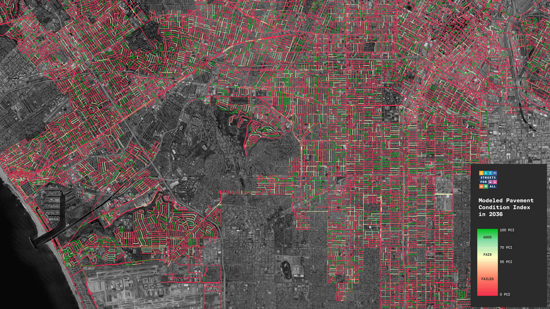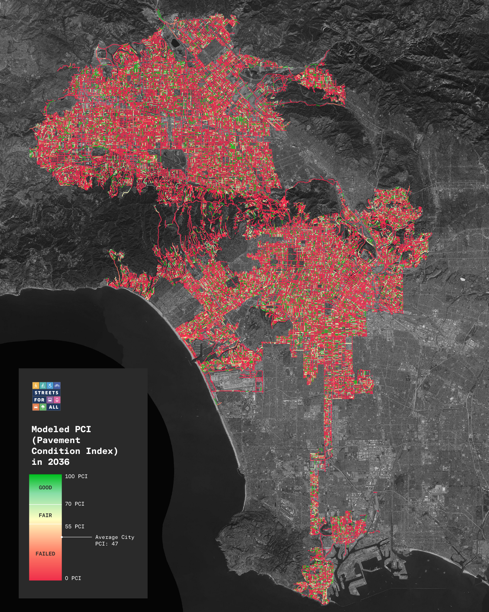 Without a change in approach, LA’s current average Pavement Condition Index (PCI) of 71 is on track to fall to 47 by 2035. At that point a majority of streets in the City will be in a failed state and will cost $15 billion to fix.