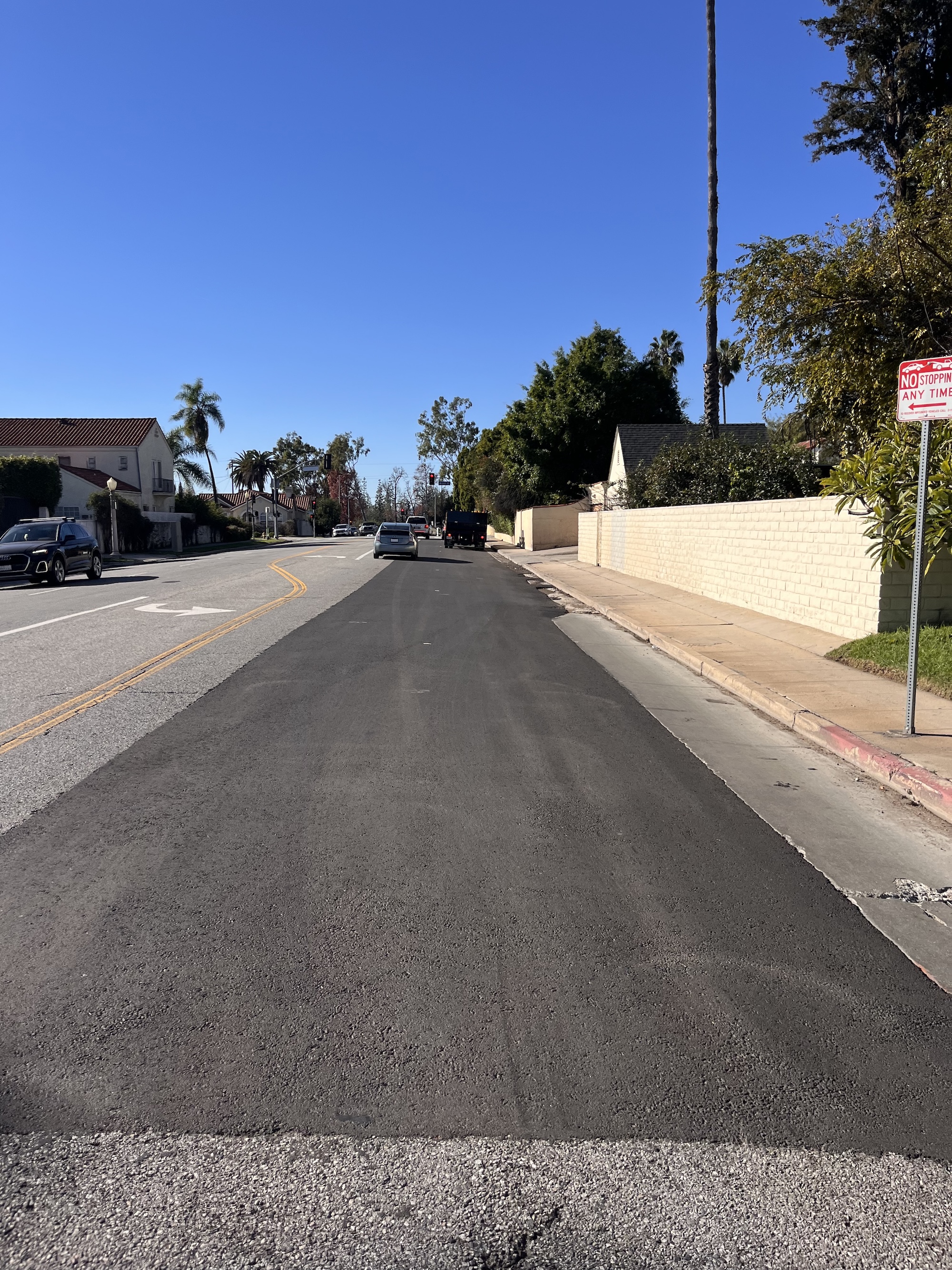 To try to avoid the cost of access ramps the City has recently begun doing what it calls “large asphalt repair”. These are standard street repairs but limited to just a portion of part of the street, often not longer than a city block, and largely ending before intersections. By not repaving through crosswalks, City lawyers believe ADA repair requirements are not triggered. Street advocates began seeing these and flagging them as an accessibility and HLA violation. (Measure HLA passed by LA voters in 2024, requires that the city implement its planned safety improvements when repaving or repairing streets.) They also seem to violate the City’s own engineering guidelines: “The scope of projects shall not be structured to avoid the obligation to provide curb ramps when altering a roadway”.