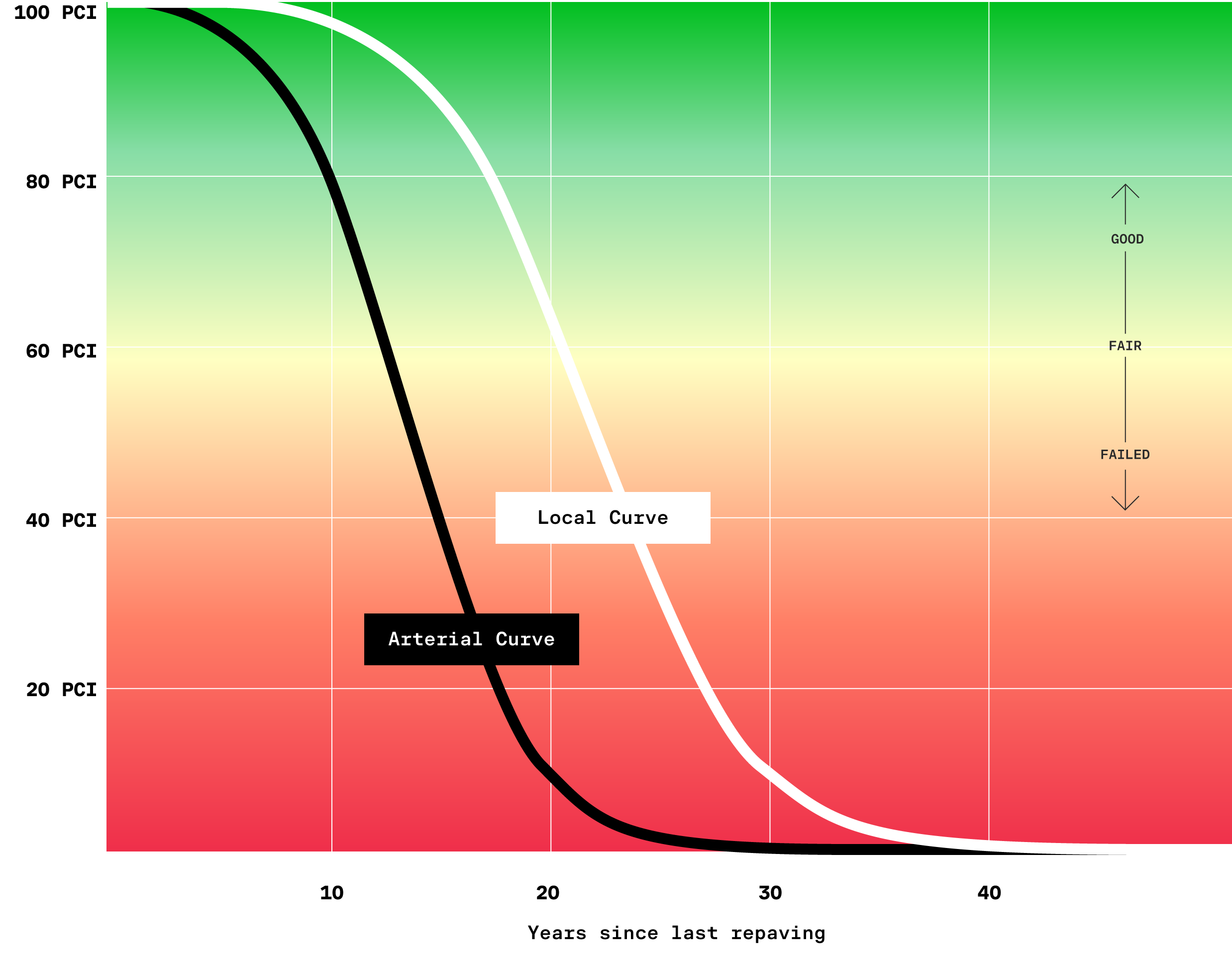 The relationship between PCI and age follows a well-established curve. When a street is repaired, it stays in a state of good repair for a while, often around a decade, but then quickly begins to deteriorate before leveling off. How quickly this deterioration happens depends on a number of variables, but for our high level model we simply used one curve to represent local streets and another for arterials.